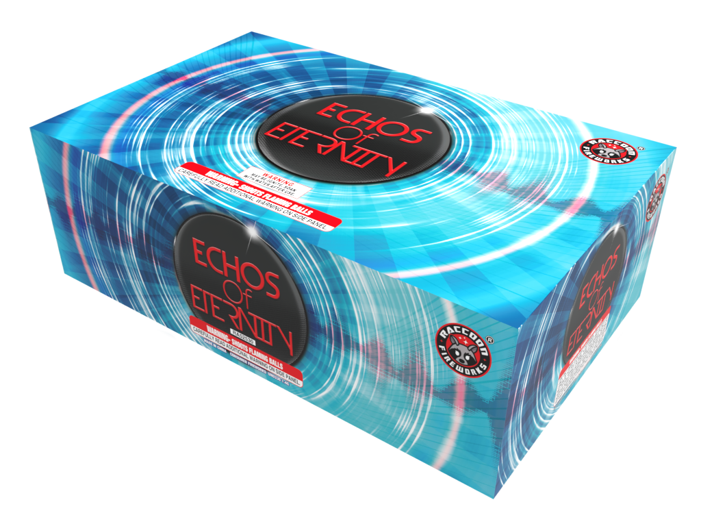 Echos of Eternity sending an eternity of good times with red crackles, blue with white strobe, brocade crown, purple with gold strobe, blood red with silver chrysanthemum, yellow peony with time rain, red palm with white strobe, blue and green peonies, crackling tails with green tips, red and blue with green strobe, titanium crackles with green strobe.