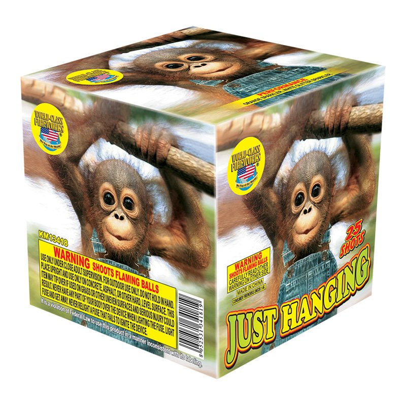 You won?t leave your audience hanging with Just Hanging! They will be excited by this 25-shot orange and white sparks extravaganza! Various effects make Just Hanging unique, along with its color combination. Make your celebration special by adding this bad boy to your arsenal. ?Awesome orange and white colors!