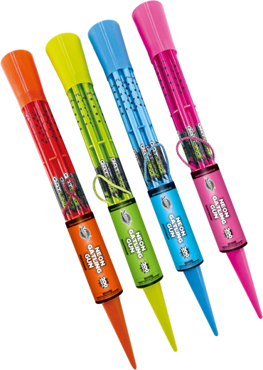 200 SHOT NEON GATLING GUN. Available in Neon Green, Neon Blue, Neon Purple and Neon Red.