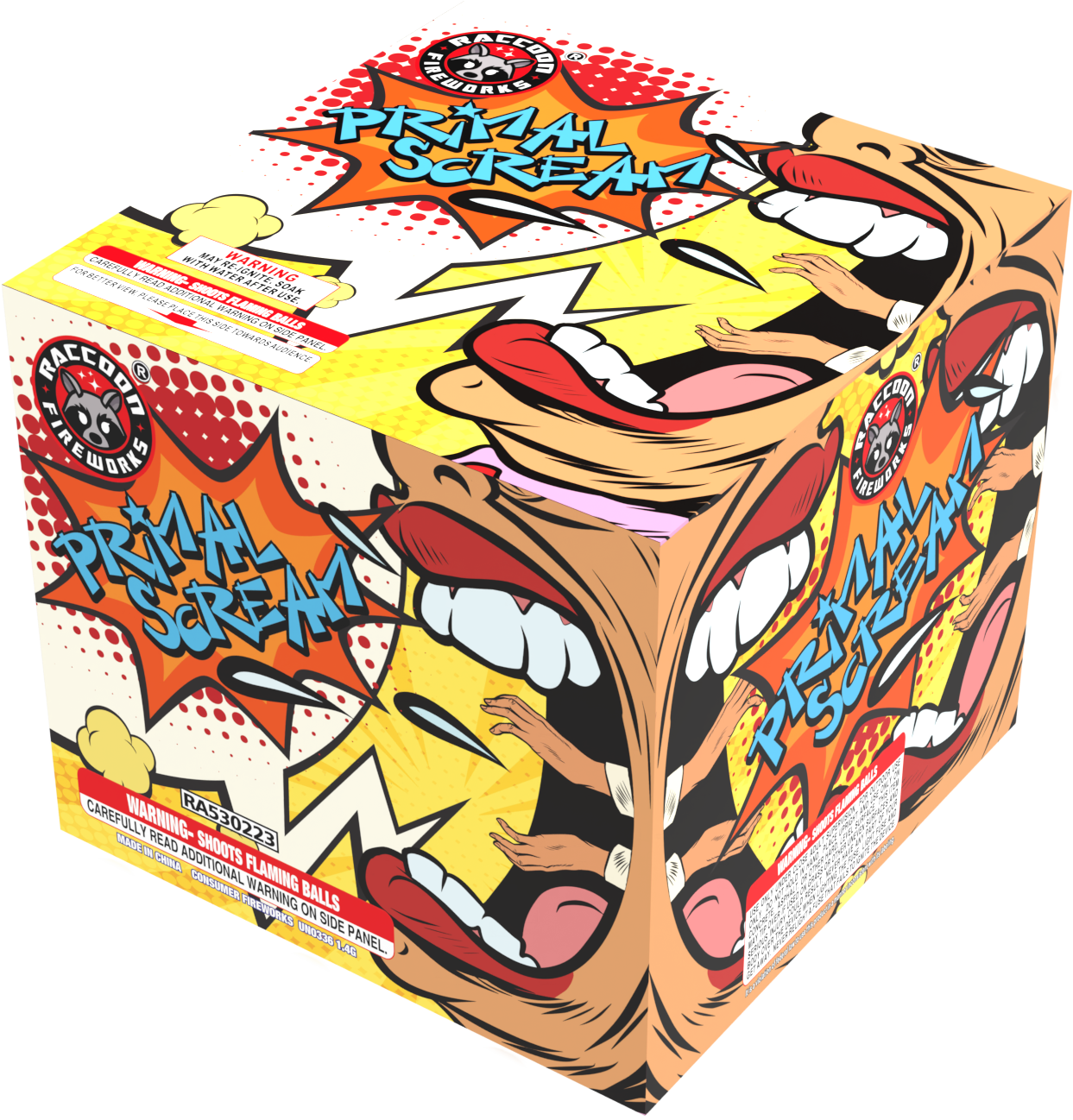 Primal Scream sending shockwaves through the night sky with intense burst of wolf howling tails to red strobe, white strobe, green strobe; fan shaped orange tails to neon orange with white strobe and green, silver and gold wander, silver spider with red and green strobe.