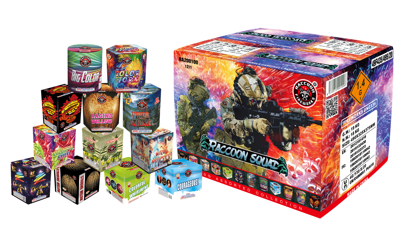 Raccoon Squad, an extraordinary assorted pack, showcasing big varieties of vibrant colors, strobes, crackling effects with total 213 shots.