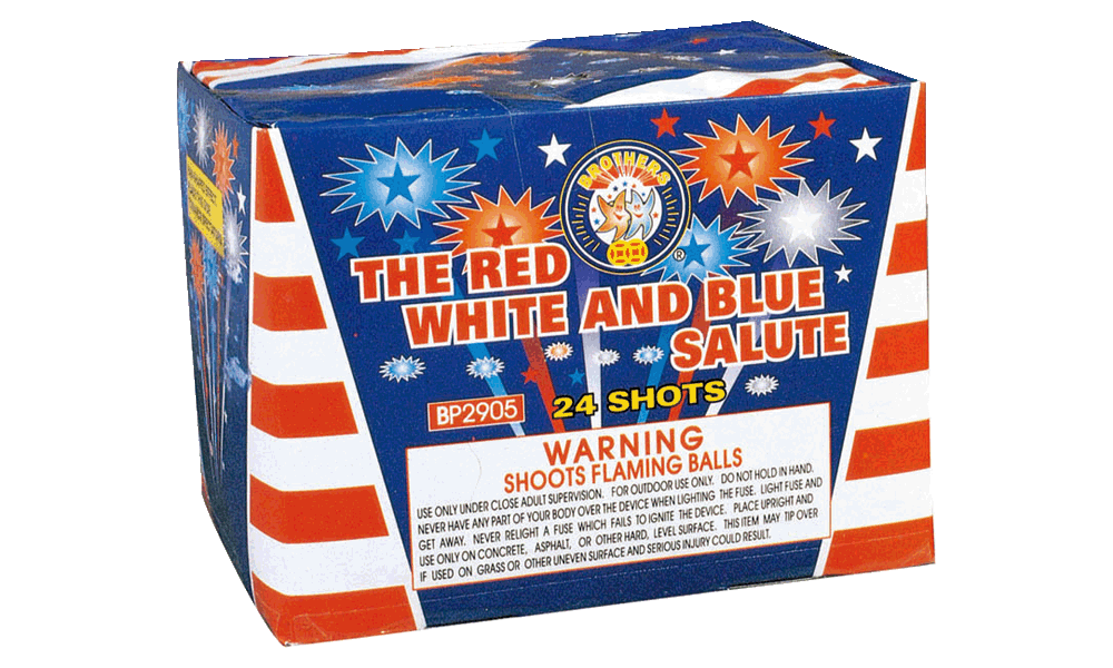 Alternating red, white and blue tails to red, white and blue bouquets and fan-shaped red, white and blue tails to red, white and blue bouquets. Three shots at a time produce fan-shaped effect. Other shots are five at a time. 24 SHOTS